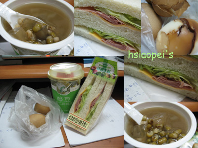 便利商店三明治1份、茶葉蛋2顆、綠豆薏仁蒟蒻湯1杯